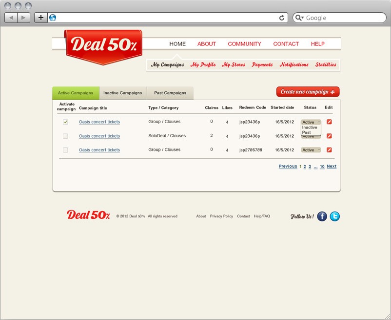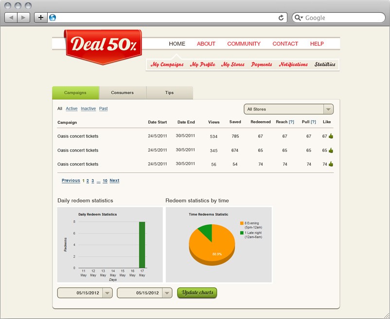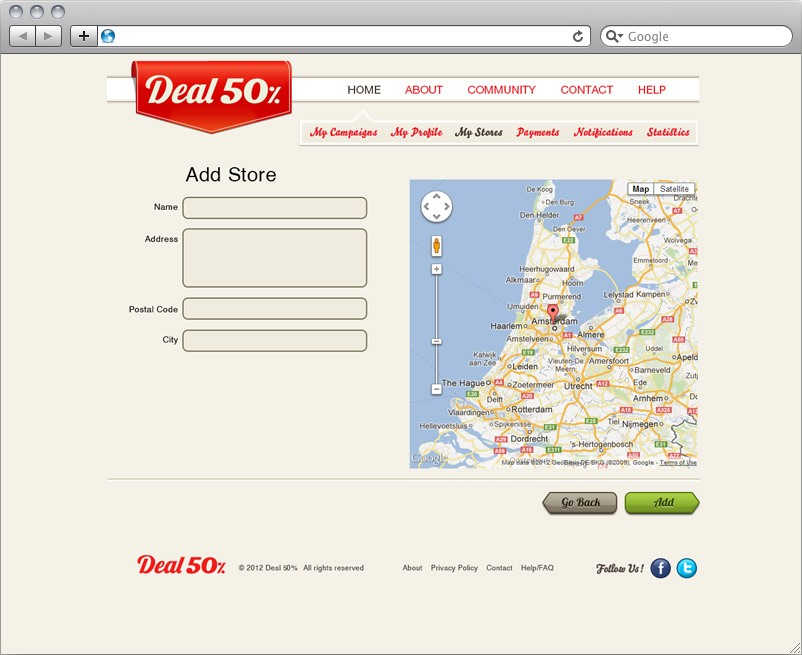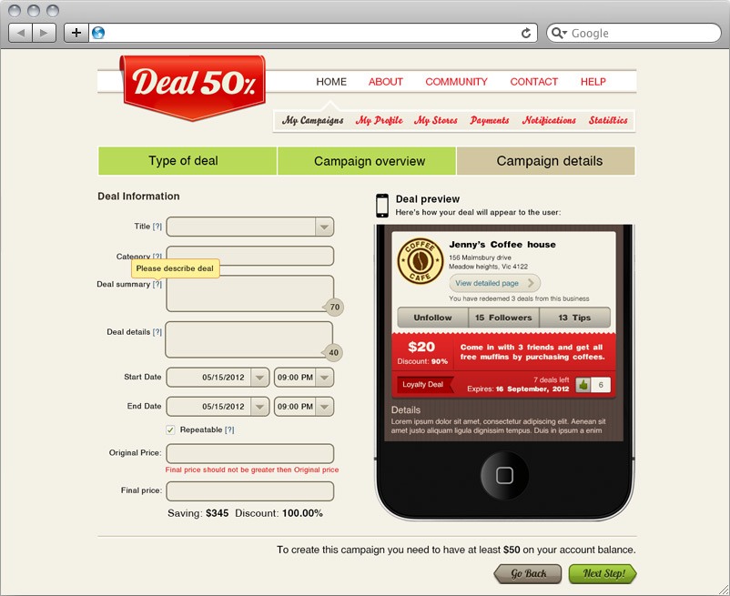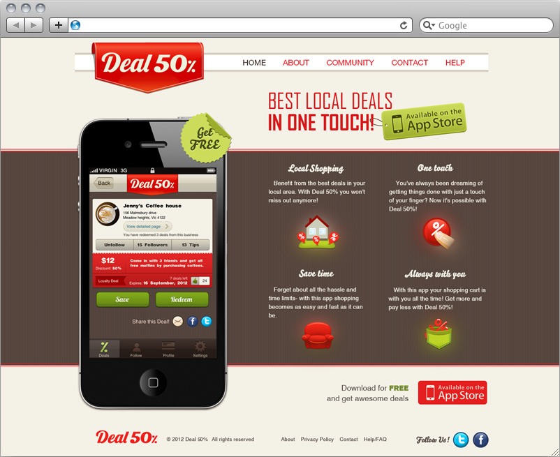 Deal 50 % is a social shopping website, that we built using ASP.NET and SQL Express technologies. It allows customers to easily benefit from the local deals, and thanks to the additional iPhone App (also developed by ABCloudz Team) has a great potential for capturing a considerable market share. We have equipped this website with social media sharing tools (Facebook, Twitter) and integrated PayPal Payment system to support our client’s business model. On top of that we have developed a well-thought-out design, which would attract more customers and contribute to the growth of the Deal50%. We have also built an easy-to-use administration panel to improve the operational efficiency of our client’s business.