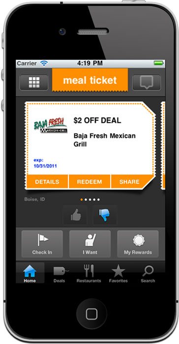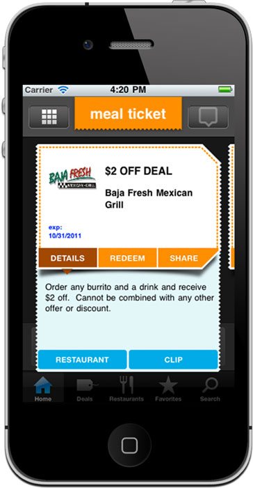 Meal Ticket – Great deals, just for you! So you’re hungry for a good meal — and a great deal, or looking for special offers? You can find both here. Meal Ticket will show you coupons and deals at restaurants near you, with reviews and ratings from other users. Pick your deal, map the location, order your meal, and flash the coupon right from your iPhone or iPod Touch — nothing to print, no coupons to clip. You’ll get instant savings on the spot. You can even pass the savings on to your friends via Facebook, Twitter, Foursquare and email, and receive alerts when your favorite restaurants post a new deal, specials, or events.