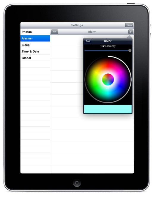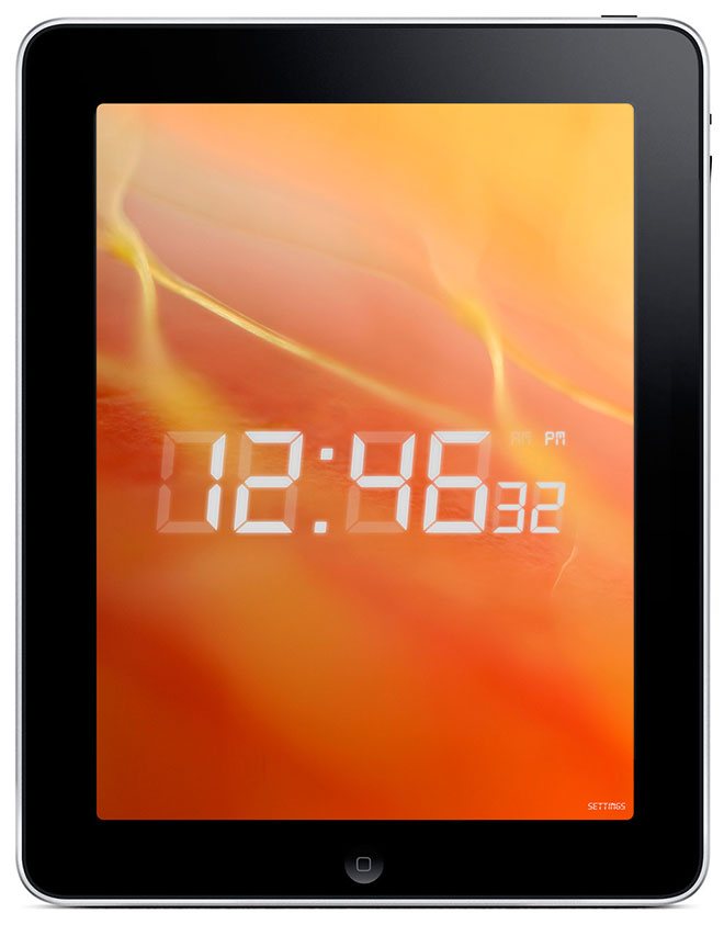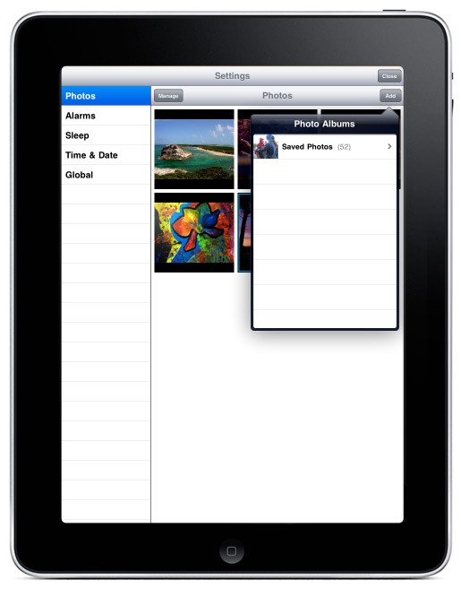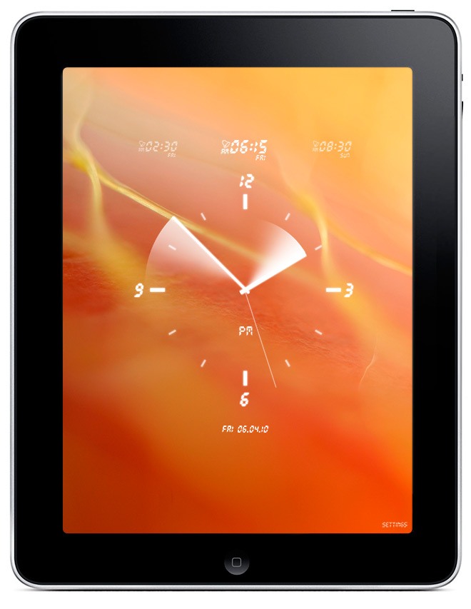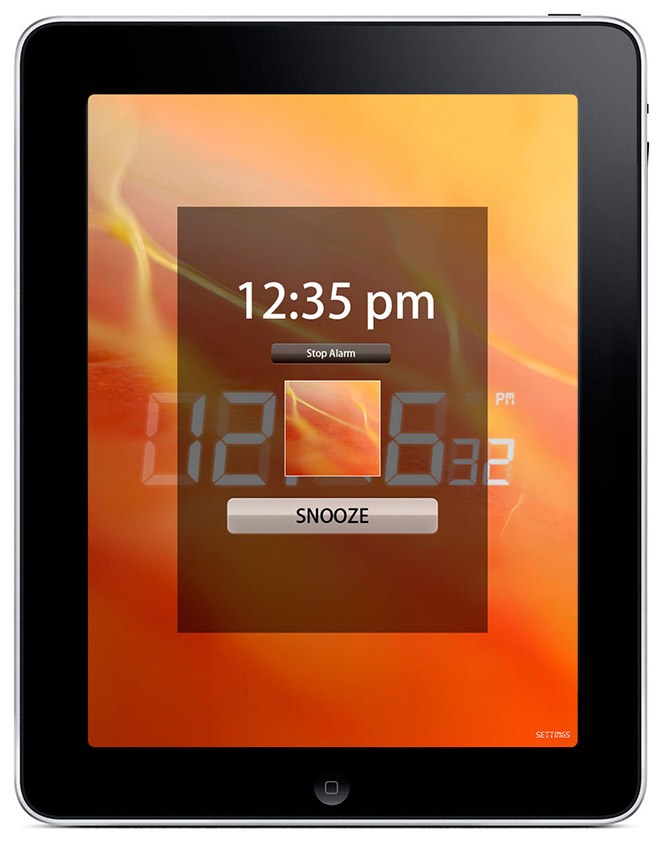 The application combines the functions of a digital picture frame with the functions of a sophisticated bedside alarm clock. The app takes advantage of the iPad’s large screen, high resolution, “split-screen” displays, and “popup” dialogs. It pulls into the app user’s favorite photos from albums and libraries on user’s device and shows them as background on the screen together with sophisticated graphics displaying time, date, alarm status and other functionality. User can select a single photo to be displayed as background or a slideshow playing pictures in a pre-set order or randomly. Day/Date/Month, Time and Alarm elements can be resized and dragged to any point of the screen. User can customize the layout of these elements by choosing the style, colors, transparency and background colors. User can also create a custom layout. Time and transition style of the slideshow can be also customized. User can choose sounds for the alarm clock and sleep mode out of four categories: