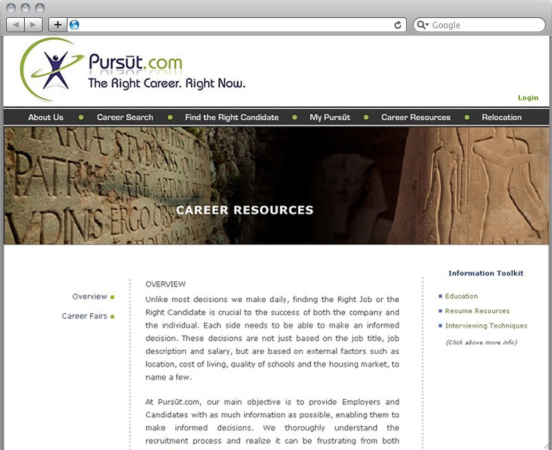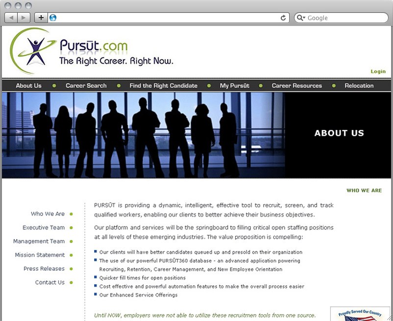 Pursut.com is a Web 2.0 service based on the ASP.NET MVC framework that connects recruiters and job seekers. PURSŪT, developed with the ASP.NET MVC framework, provides a dynamic, intelligent, effective tool for recruiting, screening, and tracking qualified workers, enabling clients to better achieve their business objectives. If you are an ASP.NET MVC developer looking for an excellent example of a Web service developed with the ASP.NET MVC framework, check out this exceptional ASP.NET MVC-based tool.